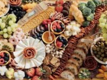 charcuterie gourmet table with fruit, cheeses, salami, hams, olives, stuffed peppers, crackers, savoury items and desserts (various).